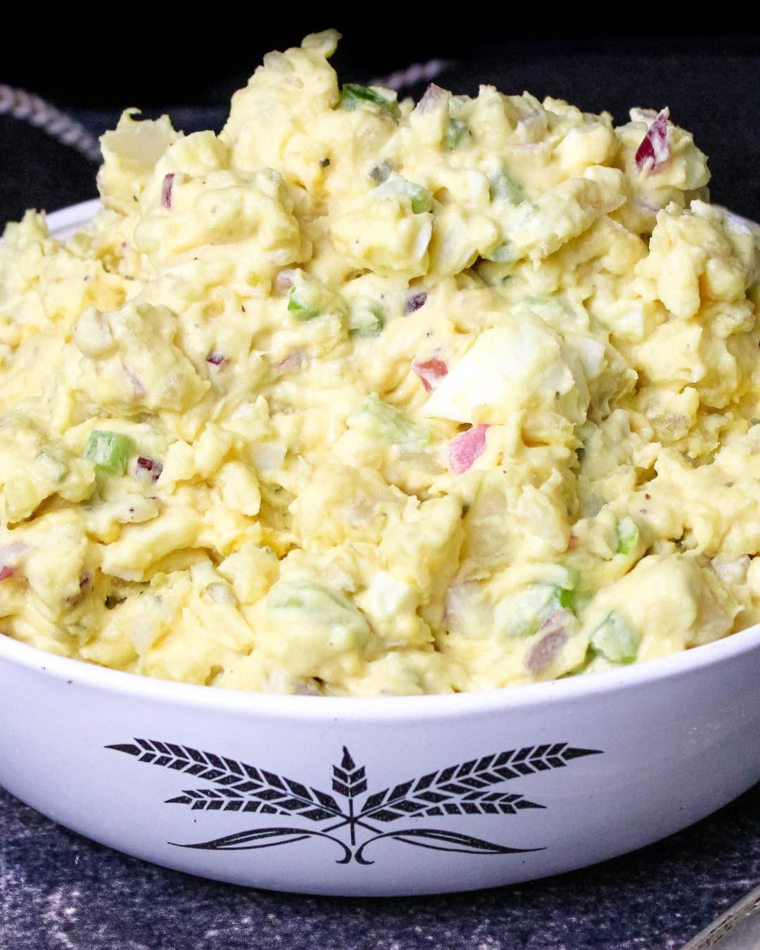 Russets tend to be fluffier, so if you prefer a lighter, less dense texture, they are a great choice. Avoid waxy potatoes like Red Bliss, as they may not hold up well in the salad.