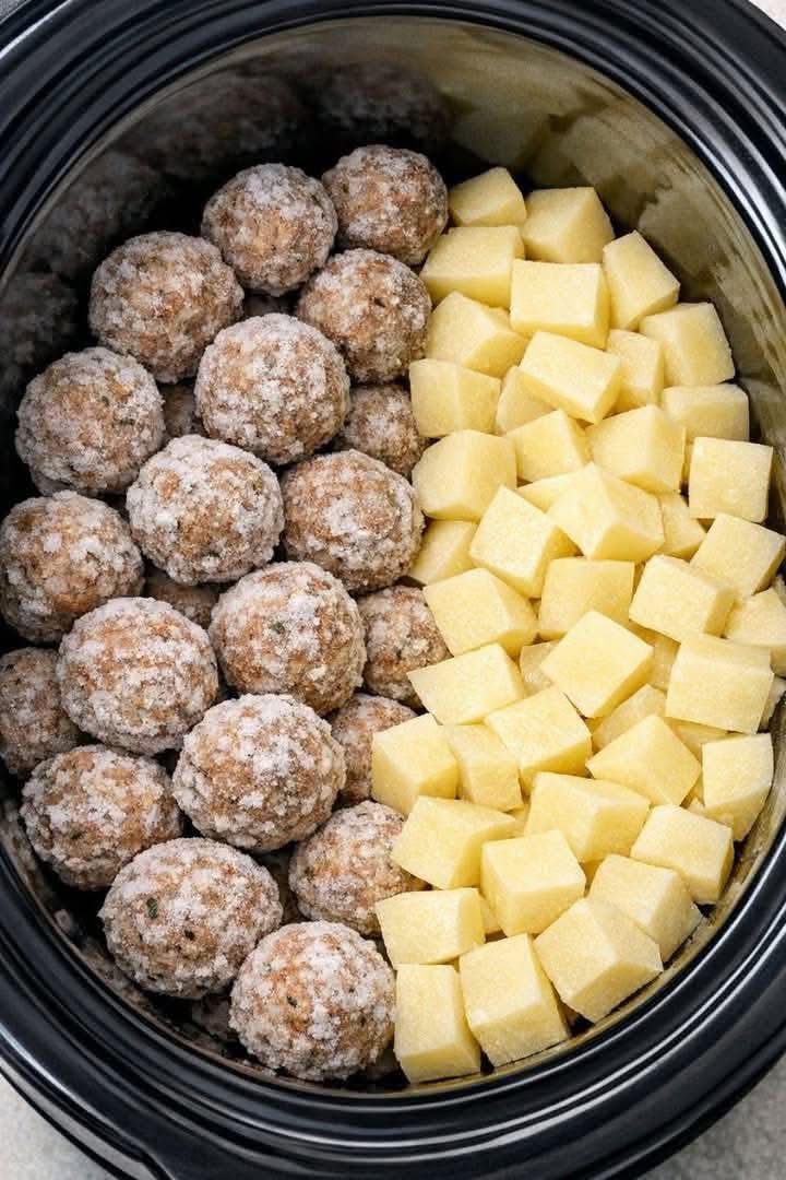 At first glance, it looks almost suspiciously simple. Frozen meatballs, potatoes, soup, broth, onion mix. But simplicity in cooking is rarely accidental. It’s compression — layers of food science and habit packed into a short ingredient list.